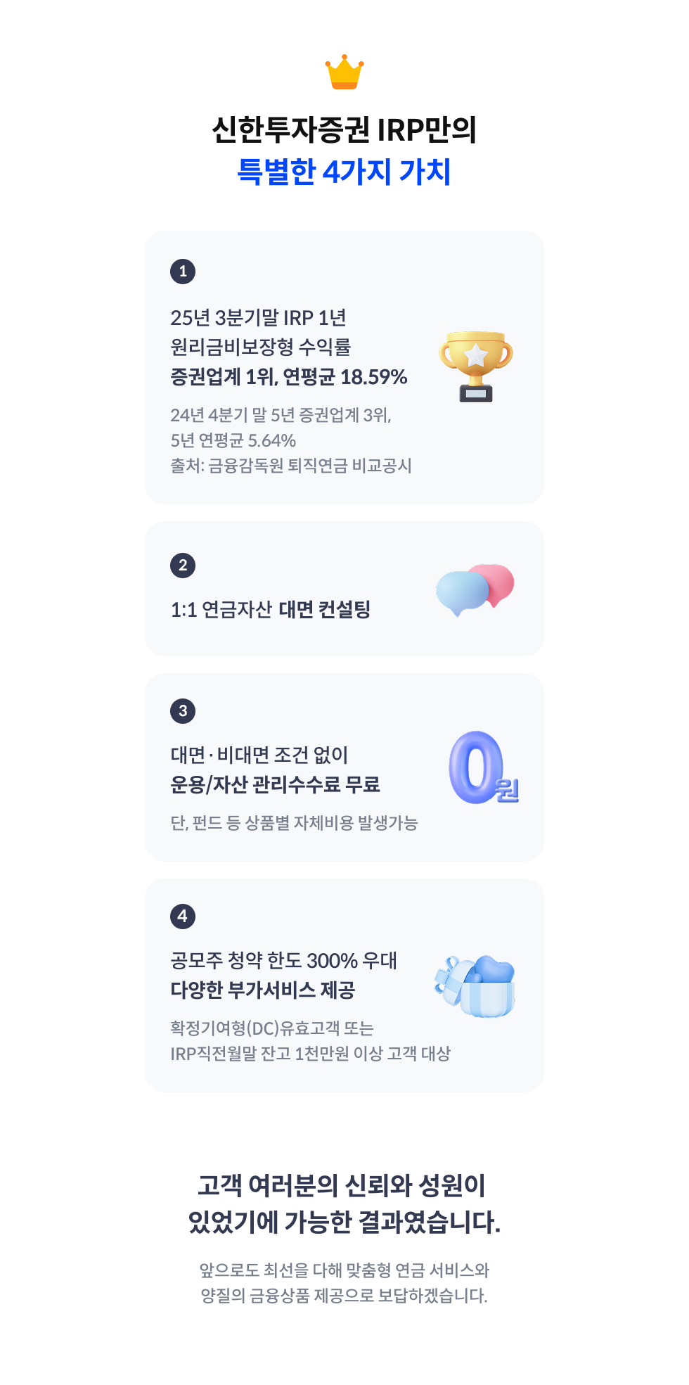25년 3분기말 IRP 1년 원리금 비보장형 수익률 증권업계 1위, 연평균 18.59% (24년 4분기 말 5년 증권업계 3위, 5년 연평균 5.64%)
