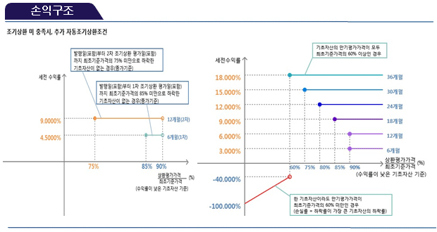 | [2차] 자동조기상환평가일에 각 기초자산의 종가 중 하나라도 90% 미만이고 발행일부터 [2차] 자동조기상환평가일까지 각 기초자산의 종가 중 어느 하나도 최초기준가격의 75% 미만으로 하락한적이 없는 경우 (종가기준) | 9.00% (연 9.00%) |